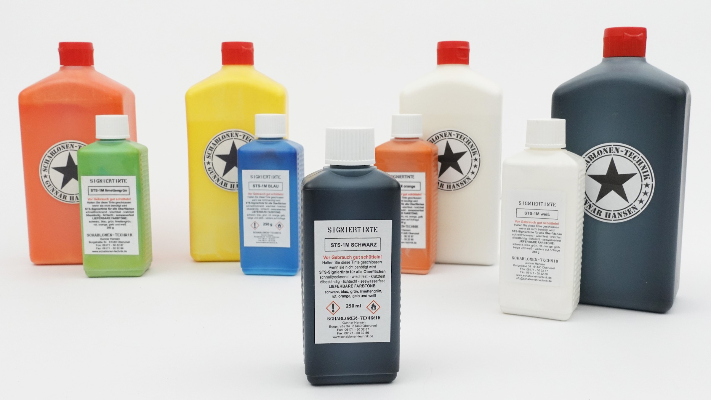 Die STS-Signiertinte erhalten Sie bei uns in acht verschiedenen Farben: Schwarz, weiß, rot, orange, grün, limettengrün, gelb und blau