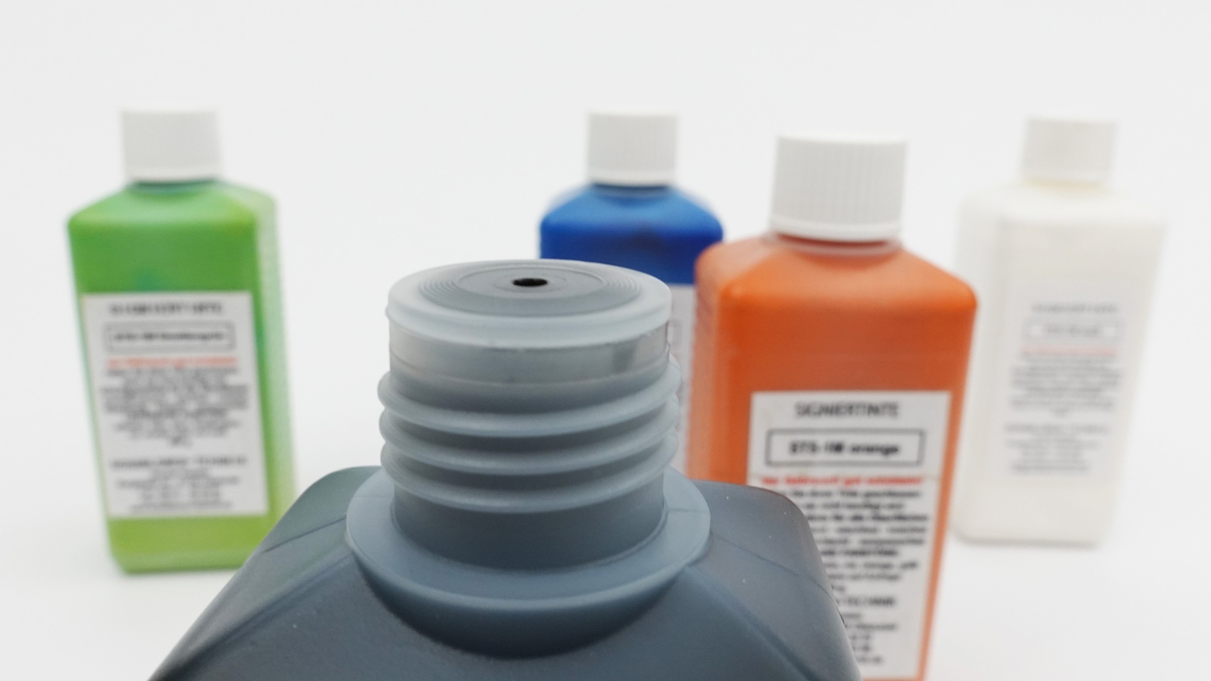 - Tinten- und Solventflaschen mit feinem Spritzausguss für gute Dosierung